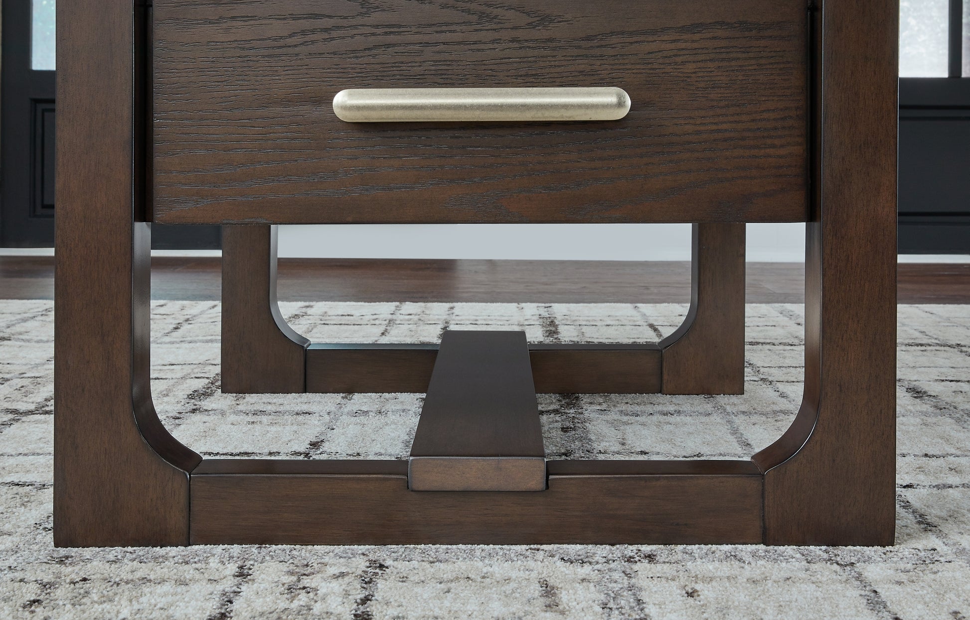 Details | Made with hardwood solids, hickory veneer and MDF substrate, Dark brown wood-tone finish, Bar pull with polished pewter-tone finish, Single smooth-gliding drawer, Assembly required | |