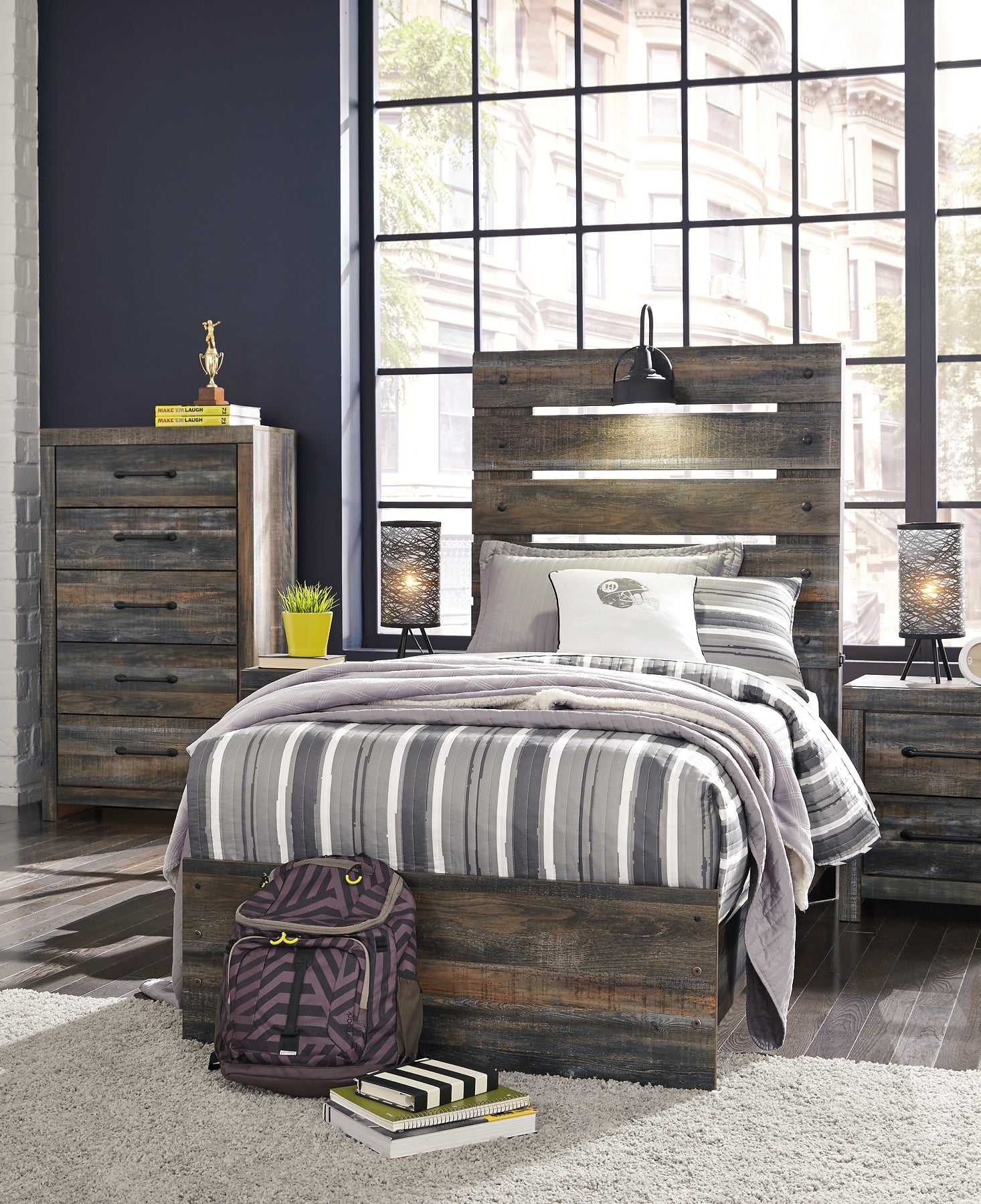 When merged in just the right way, rustic and industrial styles can make one happy marriage. Case in point: this queen panel bed. A refined take on barn board beauty, its complex, replicated wood grain showcases hints of burnt orange and teal tones for a sense of weatherworn authenticity. Love to read in bed? You’re sure to find the pair of retro-chic light sconces and USB plug-ins on the open-slat style headboard such a bright idea. Mattress and foundation/box spring available, sold separately.