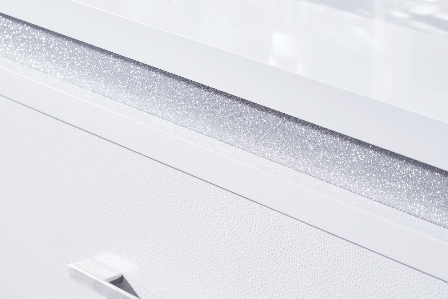 Details | Includes dresser and mirror, Dresser made with hardwood solids and MDF substrates , Mirror made with solid wood, White paint finish, Dresser with inset acrylic glitter accents, Horizontal metal drawer pulls, 6 drawers with fully finished interiors, dovetail construction and heavy-duty ball-bearing side glides, Textured drawer fronts, Mirror with inset LED lighting; 3-way dimmer switch, Power cord included; UL Listed | |