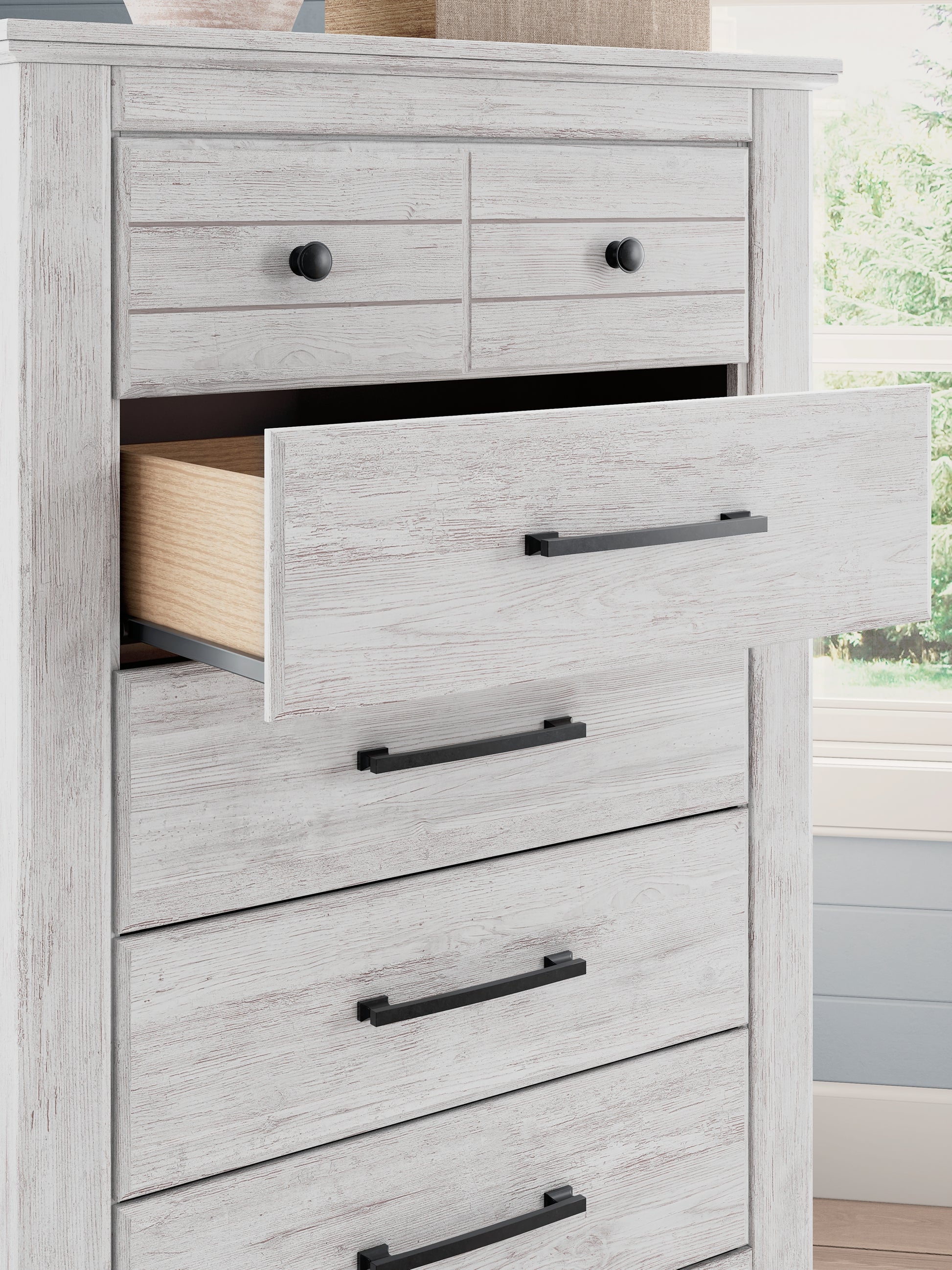 | Details | Made with engineered wood (MDF/particleboard/plywood) and decorative laminate for the right balance of affordability and durability, Whitewash replicated worn through paint over replicated wood grain with authentic touch, Decorative laminate replicates natural or man-made material surfaces with consistent color, pattern and texture, Hardware with dark bronze-tone finish, 5 smooth-gliding drawers, Safety is a top priority, clothing storage units are designed to meet the most current standard for stability, ASTM F 2057 (ASTM International), Drawers extend out to accommodate maximum access to drawer interior while maintaining safety, Minor assembly required | |