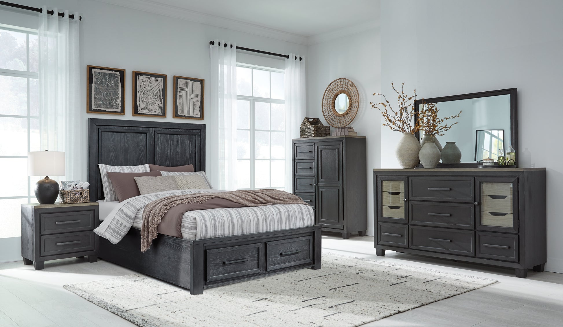 Details | B989B2: Includes queen panel headboard, storage footboard, and rails with roll slats, Made with hardwood solids, select oak veneers and engineered wood, Two-tone finish (brushed black and dusty grayish brown wood tone), Headboard with picture frame moulding, Footboard with two deep drawers, Smooth-gliding soft-close drawers with fully finished interiors and dovetail construction, Sleek drawer pulls with black finish, Bed does not require additional foundation/box spring; accommodates most zero clearance adjustable bases with the addition of a bunkie board, Mattress available, sold separately, Assembly required, B989B1: Includes dresser and mirror, Made with hardwood solids, select oak veneers and engineered wood, Two-tone finish (brushed black and dusty grayish brown wood tone), Sleek drawer pulls with black finish, 11 soft-close, smooth-gliding drawers with fully finished interiors and dovetail construction (top drawers felt lined), 5 drawers with brushed black finish; 6 drawers with grayish brown wood tone, 3 drawers located behind each door, Mirror mounts to back of dresser, Assembly required, | |